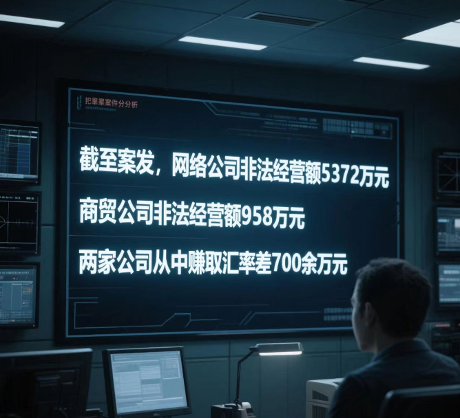 那么,周某等人的涉案金额又该如何计算?公安机关对交易记录与资金流水进行核查,对比境外平台销售所得货币与境内人民币兑换的汇率差异,计算套利金额,同时调取银行账户、第三方支付平台的流水,分析资金进出频率、金额匹配性,剔除正常交易后汇总非法所得。截至案发,网络公司非法经营额5372万元,商贸公司非法经营额958万元,两家公司从中赚取汇率差700余万元。